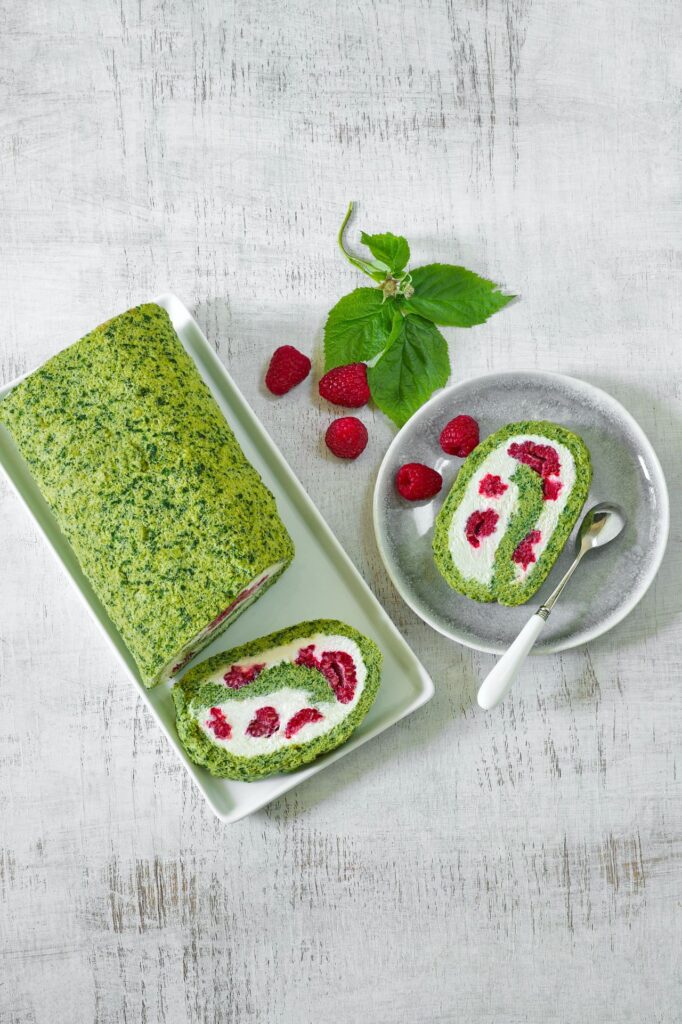 Farbu roláde dáva čerstvý špenát. V ceste ho ale vôbec necítiť. Roláde dominuje mascarpone krém s vanilkovým cukrom a šťavnatými malinami: ľahký, svieži, s mierne kyslým podtónom. Kompletný recept na machovú roládu nájdete na stránkach Dr. Oetker.